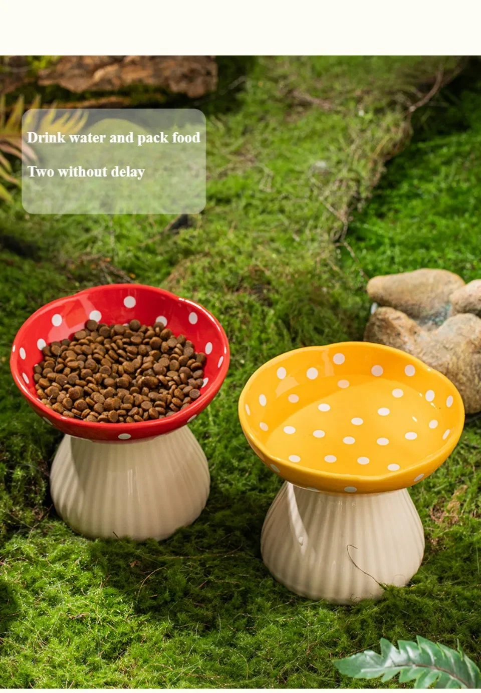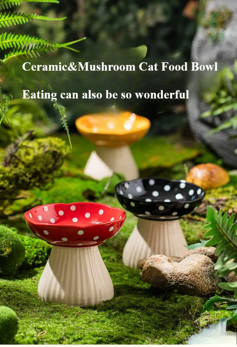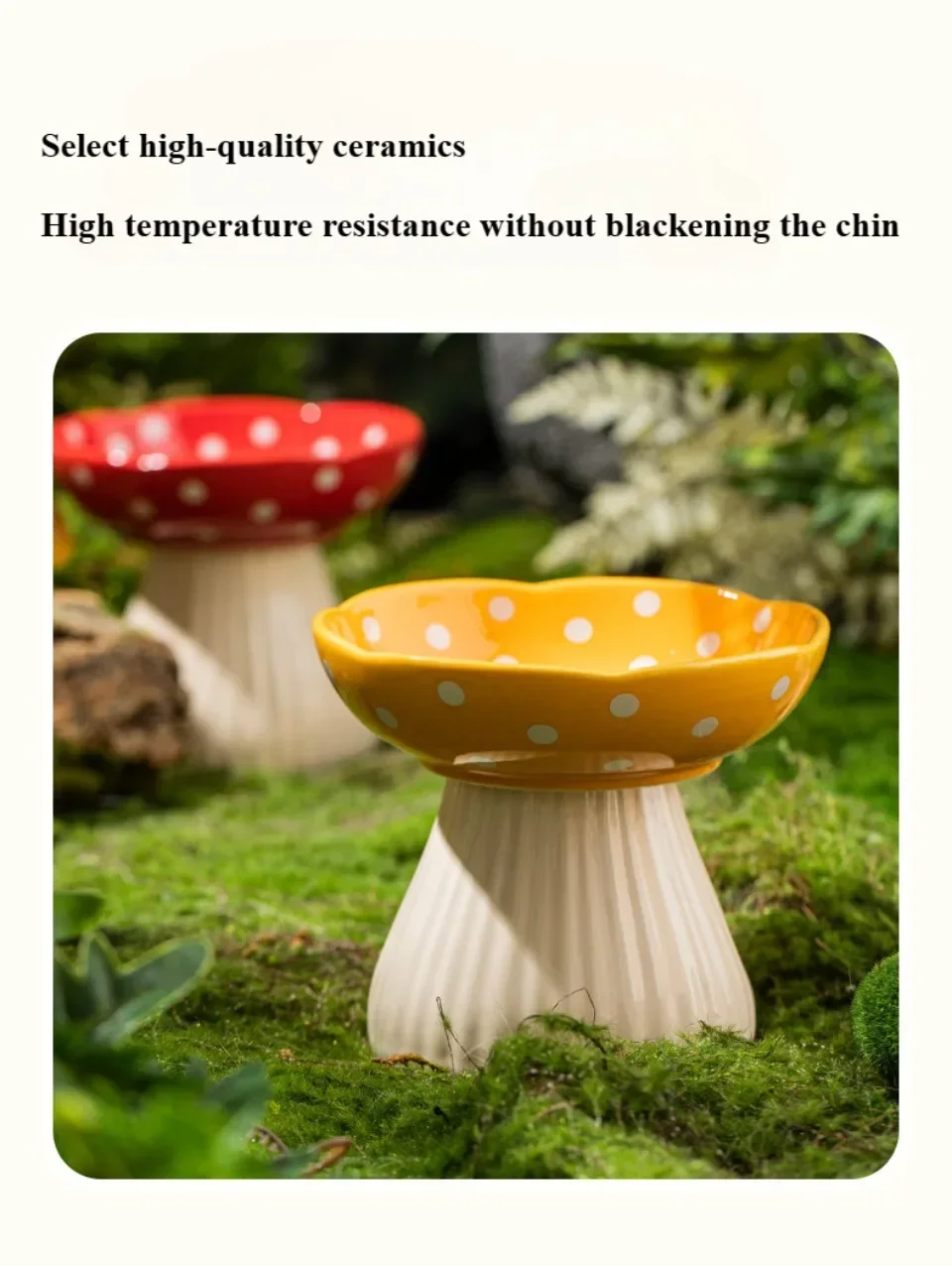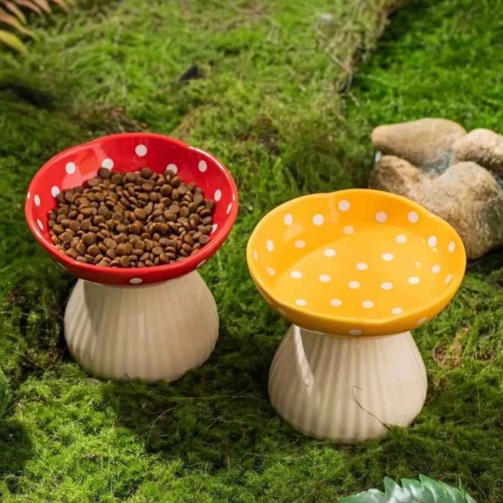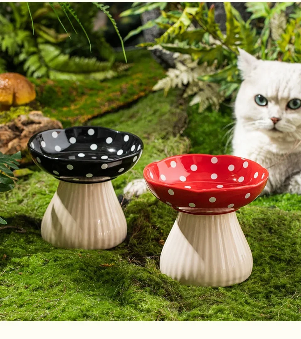 NobleKitty Mushroom Ceramic Cat Bowl – Cute Elevated Feeder with Polka Dots for Cats & Small Dogs